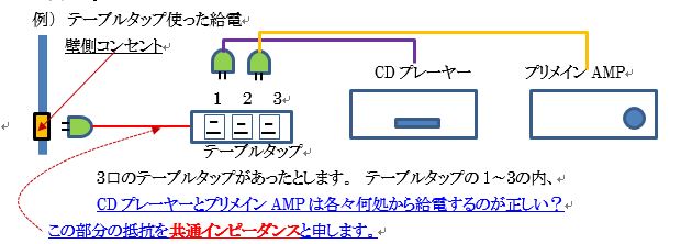 つまり上図で示した1本の電力ケーブルを使い多種多様な電力を同時に扱う場合、一番電力量の大きい機器の影響を、この赤ライン上の共通インピーダンスの影響で、電力量の少ない機器側が受けてしまう事になります。 ですからパワーAMPは壁コンセントから可能な限り短くダイレクトに給電する。CD系など電力量の少ない機器は、同様に壁コンセントからダイレクトに給電しますが、可能なら別系統の壁にあるコンセントから給電するのが望ましいのです。