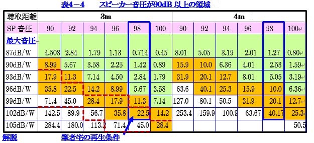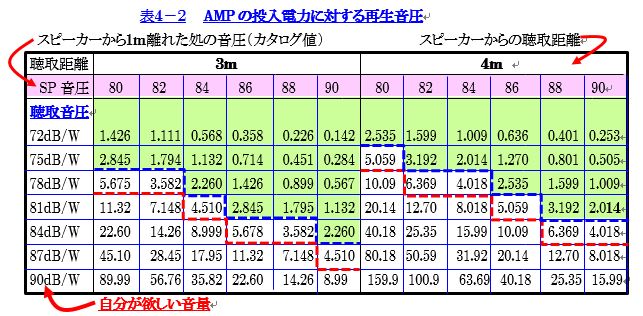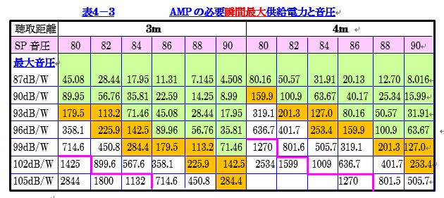 スピーカー音圧が10dB高いと、AMPのパワーは1/10で済む事が表4-4から理解出来ます。