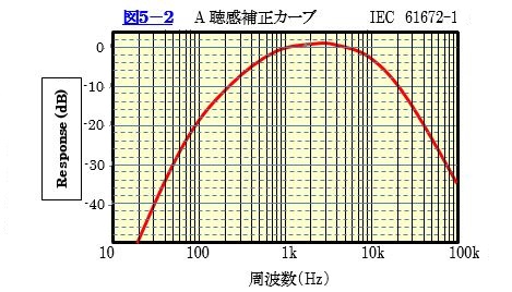 これはノイズの聞こえ方を、人間の聴覚特性に合わせて計測しようとするものです。 その周波数特性を図5-2に示します。この測定フィルターカーブの規格は、IECで審議され国際規格になっております。通常この聴感補正を入れて計る場合と、フラットな周波数で評価する場合と両方あります。