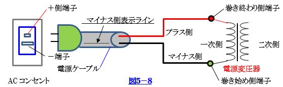図5-8に示す通り、給電ラインの+側は、変圧器一次側巻線の巻終わり側に接続され、その反対側の巻スタート側は、給電端子のGND側に接続され、製造時に組み立てが管理されております。