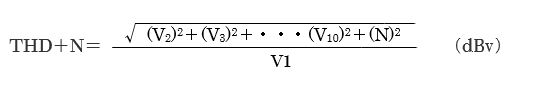 この場合ノイズを含めた形の、THD(Total harmonic distortion)として評価し、カタログ表示されます。ノイズ電圧をN 各高調波成分の電圧V2 ~V10 と 基本波電圧をV1 とすれば、歪+ノイズNは電力として表しますので、下式の形で表す事が出来ます。