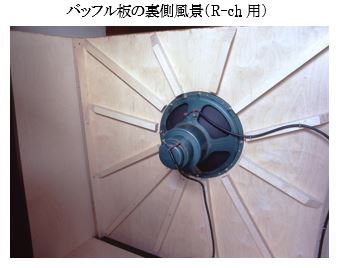 バッフル板は床から5mm浮かせる構造で、スピーカー取り付け位置から放射状に、360方向に響棒を張り