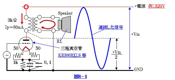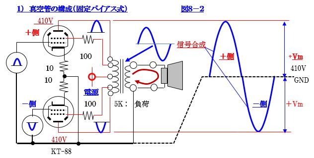 図8-1より、A級増幅は電圧利用率が悪く小出力ですが、出力側のAudio信号波形を合成するプロセスが無く、素直に入力信号をそのまま電力に変換しますので、物理的には理想的な増幅動作となります。従って、中高音以上の領域では音質的には、最も優れた増幅方式であり、これ以上の手法は存在しない