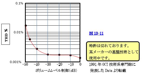 図13-11に音量変化させた時のTHD(総合歪)との関係を示します。