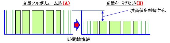 波形だったと仮定しましょう。 この時音量を制御する手法として、時間軸上に並ぶPWM情報には一切触れないで、電圧のみ下げる制御した時の波形をBとします。 この意味は、一切の情報は時間軸情報に集約されておりますから、単純に電圧が下がる事であり、伝送される情報が欠損する事はありません。 これが、筆者等が開発したデジタルボリュームの基本原理です。