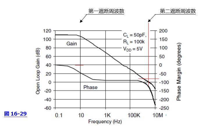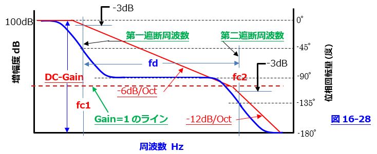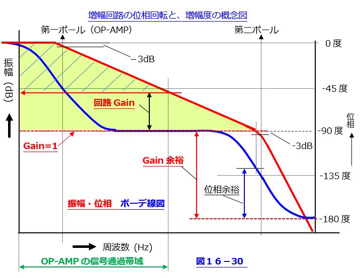 図より伝達系の増幅度が消滅した時点の周波数ポイントの時、位相がどれだけ回転しているか? この値を把握します。 そしてこの値が-180度からどの程度手前の値を示すか?
